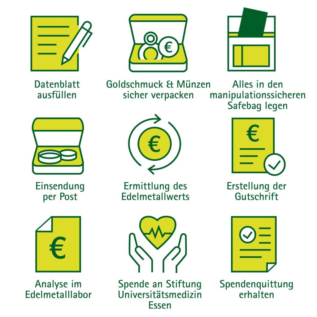 Jeder Mensch besitzt alten Schmuck, einzelne Ohrringe, beschädigte Ketten oder Münzen, die längst keine Bedeutung mehr haben – aber dennoch etwas wert sind. Mit Ihrer Goldspende verwandeln Sie Edelmetalle in Hilfe für schwerkranke Menschen an der Universitätsmedizin Essen.