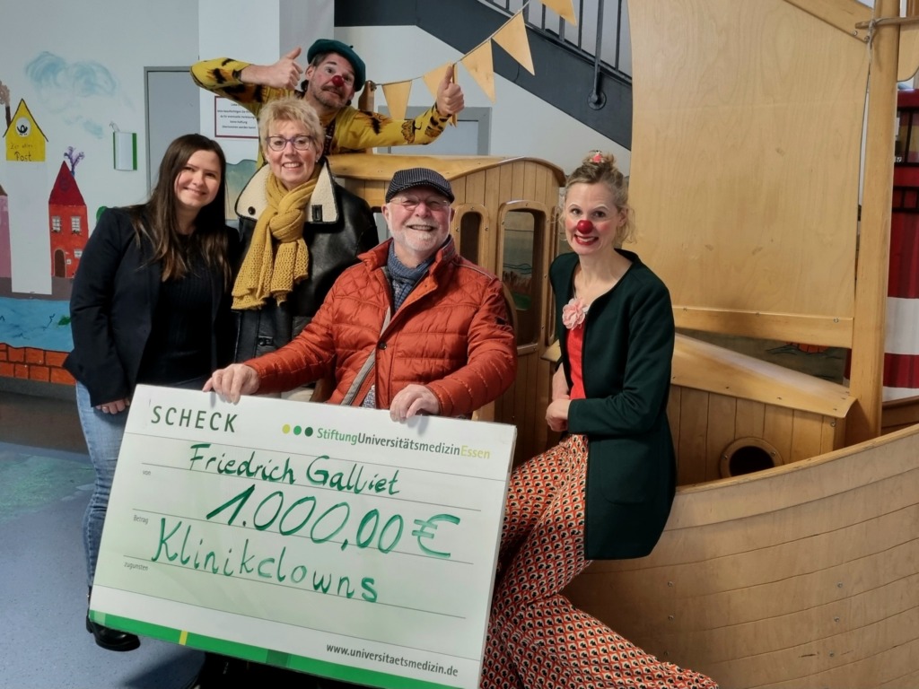 Überreicht wurde die Spende bei einer symbolischen Scheckübergabe an die Stiftung Universitätsmedizin Essen. Entgegengenommen wurde sie von Nathalie Mazur, Referentin Spenderservice. Bei dieser Gelegenheit lernte das Ehepaar auch die beiden Klinikclowns Möwe und Rumpel persönlich kennen. „Die Klinikclowns sind ein Angebot, das über die medizinische Grundversorgung hinausgeht. Daher ist es auf Spenden angewiesen“, erklärt Nathalie Mazur. „Ich danke dem Ehepaar Galliet sehr Herzlich für die großzügige Unterstützung“