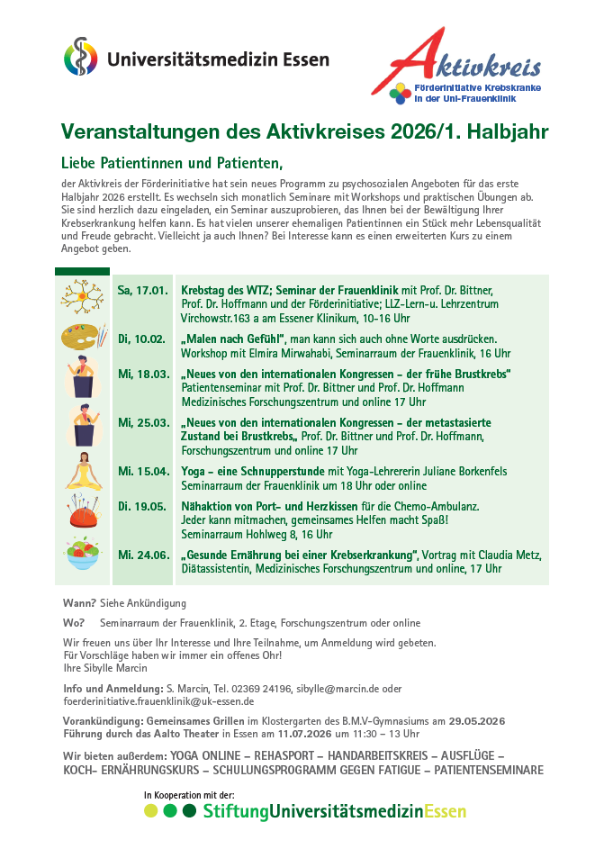 Sie sind von einer Erkrankung betroffen, die Sie vor große Herausforderungen stellt. Die „Förderinitiative für Krebskranke in der Uni-Frauenklinik“ möchten Ihnen gemeinsam mit der Frauenklinik des Universitätsklinikums Essen helfen, Ihr Schicksal zu meistern, damit Sie körperlich und seelisch genesen können und Ihren Weg zurück in den Alltag finden.